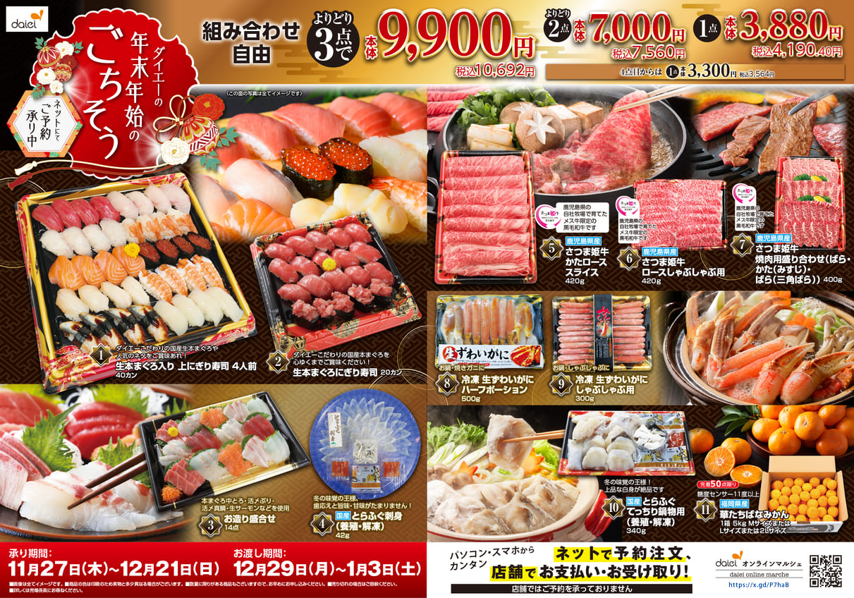 | 注意事項 | ●こちらの商品はダイエーオンラインマルシェクーポン対象外とさせていただきます。 ●商品のキャンセルは注文期間内(11/27~12/21)のみとさせて頂きます。 |