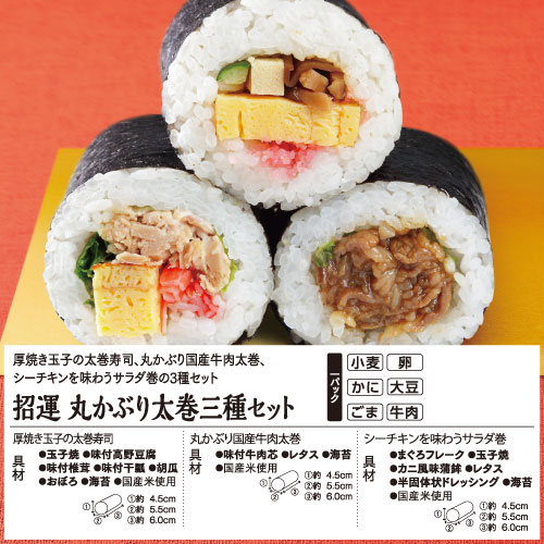 | 商品説明 | 厚焼き玉子の太巻寿司、丸かぶり国産牛肉太巻、シーチキンを味わうサラダ巻の3種セット |