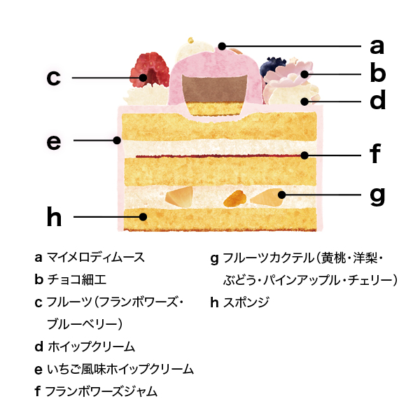 商品説明 | フルーツをサンドしたスポンジに苺クリームやフランボワーズ&ショコラが香るマイメロディのムースでクリスマスらしさを演出。 |