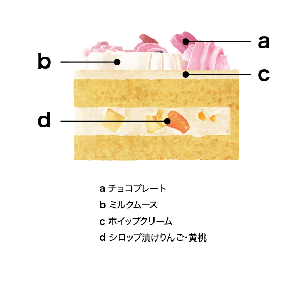 商品説明 | りんごと黄桃のシロップ漬けをサンドしたケーキにミルクムースのハローキティ&ハローミミィをトッピングしました |