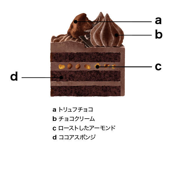 | 商品説明 | さっぱりとしたチョコクリームとローストしたアーモンドをココアスポンジでサンドした糖質を抑えたケーキ |