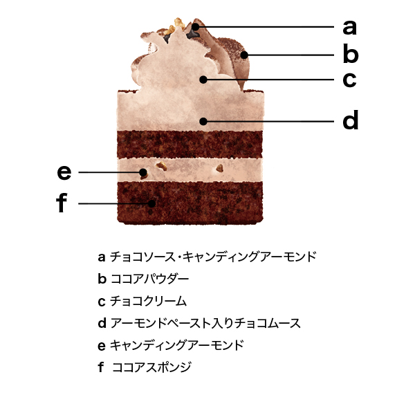 商品説明 | アーモンドペースト入りチョコムースをココアスポンジでサンドした、アーモンド風味のショコラケーキです |