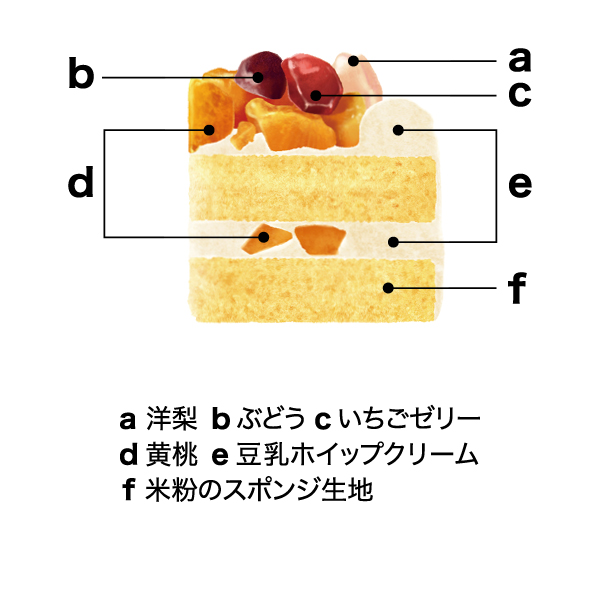商品説明 | 【8大アレルゲン不使用ケーキ】米粉のスポンジに豆乳ホイップクリームと黄桃をサンド。黄桃・洋梨・ぶどう・いちごゼリーをトッピングしました。 |